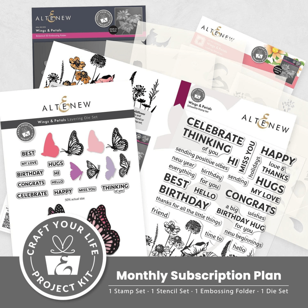 These are fun products that only contain non-consumable items like stamps, dies, embossing folders, and stencils. There are many subscriptions for these products. People who have a fair amount of their own paper products and are looking to expand their collection do best with these kits. Waffle Flower, Spellbinders and Altenew are companies who offer these types.