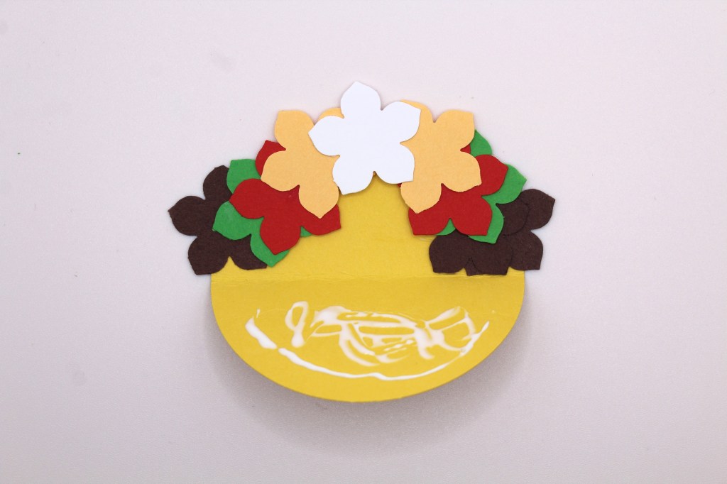 Then build your taco as you please, in real life, mine would have more cheese and sour cream. It needs adhesive on both sides to hold everything together. So, glue or use a tape runner to add the flowers to one side of the shell with as many or as little flowers as you want. When you are done add your adhesive to the other side of shell and close it.