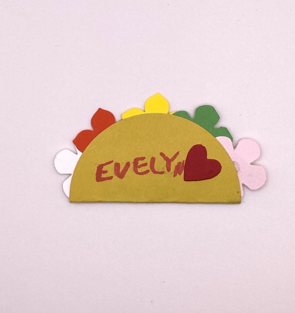 Evelyn loves to make things out of paper and she designed these adorable paper tacos! The ersatz entree can be used as a gift tag or just to share with friends. Evelyn loves to add these to cards she mails to her friends. It is sure to bring a smile any way it is shared!